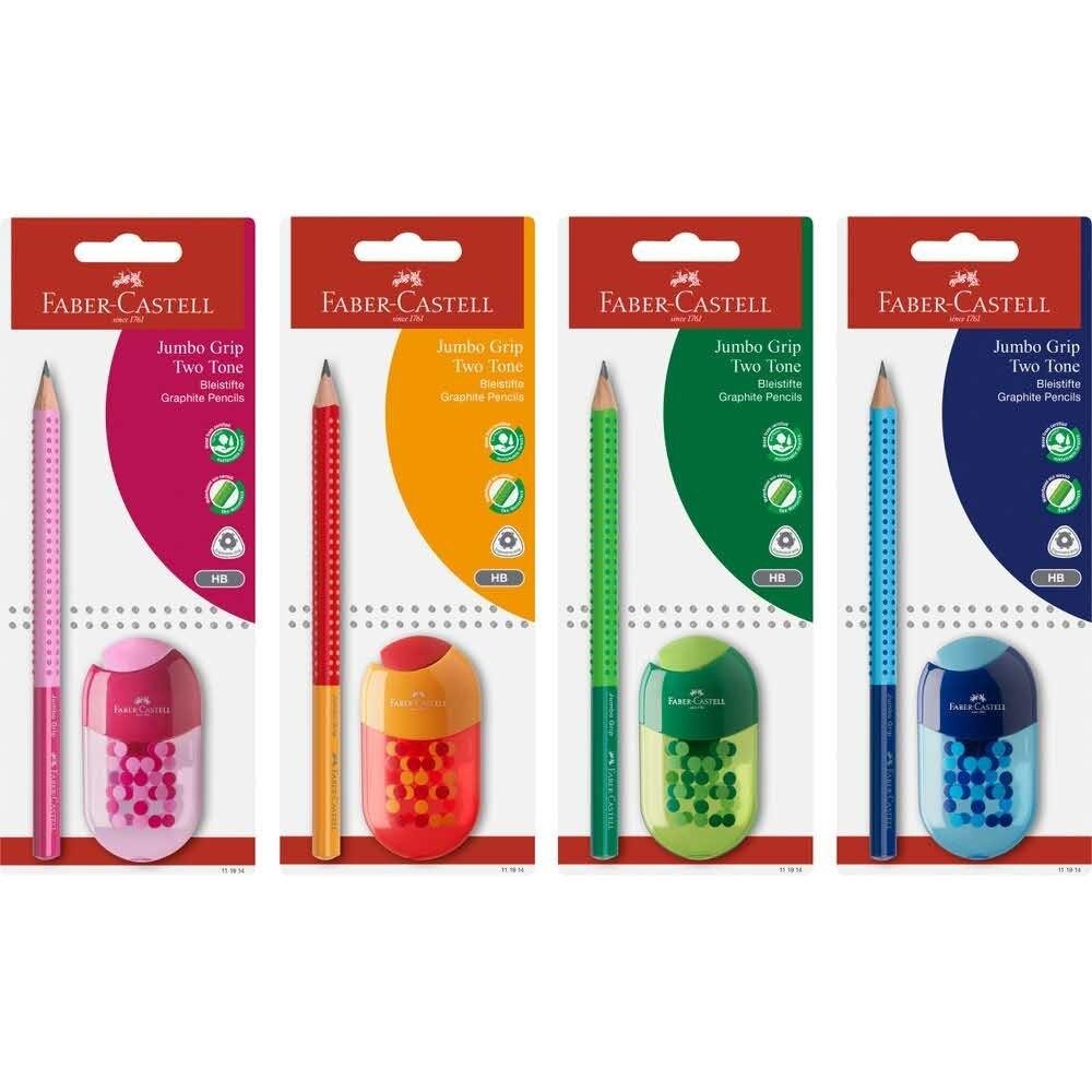 Zestaw z ołówkiem grafitowym Jumbo Grip Two Tone Faber-Castell mix kolorów (jasnozielono-zielony, pomarańczowo-czerwony, jasnoniebiesko-niebieski, jasnorózowo-różowy) z pasującą temperówką z gumką w opakowaniu blistrowym. Nawet w czasach zdominowanych przez komputery, telefony i internet, ołówek wciąż pozostaje nieodłącznym towarzyszem codzienności. To doskonałe w swojej prostocie narzędzie. Ergonomiczny trójkątny kształt i charakterystyczna dla tej serii opatentowana strefa Grip z małymi, antypoślizgowymi punktami zapewniają wysoki komfort użytkowania i niemęczące, wygodne pisanie i szkicowanie. Odpowiednie również dla leworęcznych. Większy rozmiar doskonały do nauki pisania. Z odpornym na pękanie grafitem o stopniu twardości HB, dzięki bezpiecznemu procesowi wiązania (SV). Wykonane z certyfikowanego drewna pochodzącego ze zrównoważonego i odpowiedzialnie zarządzanego leśnictwa. Powierzchnie pokryte lakierem na bazie wody bezpiecznym dla środowiska i zdrowia dzieci. Gumka w temperówce bez zawartości PVC.