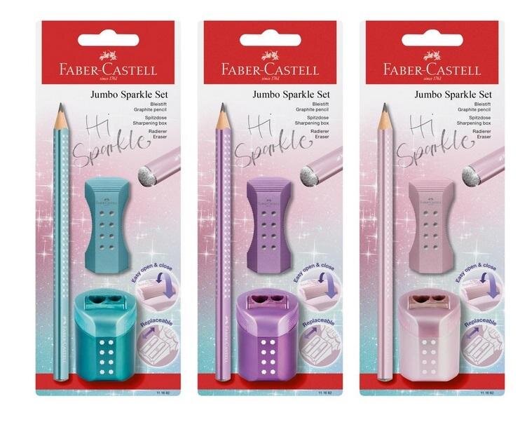 Sada s grafitovou tužkou Jumbo Sparkle Faber-Castell v barvách série Cosmic s gumou RollOn Sparkle a ořezávátkem RollOn Sparkle. Unikátní design s atraktivními třpytivými tečkami byl navržen tak, aby dodal lesk běžnému stolnímu dni. Tužka má třpytivý hrot. Ergonomický trojúhelníkový tvar zajišťuje vysoký komfort používání a nezatěžující, pohodlné psaní a skicování. Větší velikost je ideální pro výuku psaní. Vhodná i pro leváky. S odolným proti lámání grafitem tvrdosti HB, díky bezpečnému procesu vazby (SV). Vyrobeno z certifikovaného dřeva pocházejícího z udržitelného a odpovědně spravovaného lesnictví. Povrch pokrytý lakem na vodní bázi, bezpečným pro životní prostředí a zdraví dětí. Guma bez obsahu PVC.