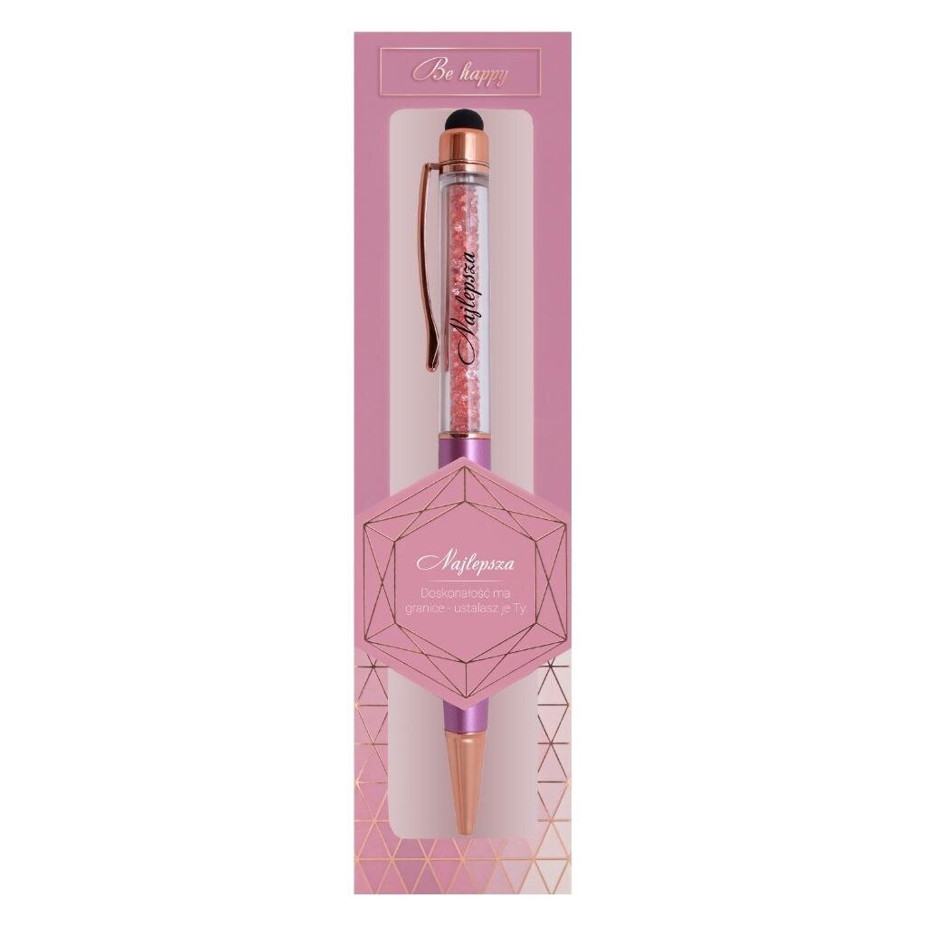 Długopis z kryształkami - elegancki upominek stylowy i funkcjonalny długopis z napisem (dedykacja widoczna na zdjęciu) to doskonały pomysł na prezent, który łączy elegancję i praktyczność. Dzięki dekoracyjnym kryształkom w obudowie długopis przyciąga wzrok i dodaje odrobiny luksusu. Metaliczna obudowa w delikatnym fioletowym odcieniu z subtelnym napisem sprawia, że jest to idealny upominek dla wyjątkowej osoby. Długopis wyposażony jest w końcówkę typu touch pen, która umożliwia wygodne korzystanie z ekranów dotykowych, co czyni go jeszcze bardziej funkcjonalnym. Wkład w kolorze niebieskim można łatwo wymienić, co pozwala na długotrwałe użytkowanie. Produkt zapakowany jest w eleganckie pudełko prezentowe, które podkreśla jego wyjątkowy charakter. Specyfikacja produktu: Napis: (widoczny na zdjęciu); kryształki w obudowie; Funkcjonalność: końcówka typu touch pen do ekranów dotykowych; Kolor wkładu: niebieski (wymienny); Opakowanie: eleganckie pudełko prezentowe
