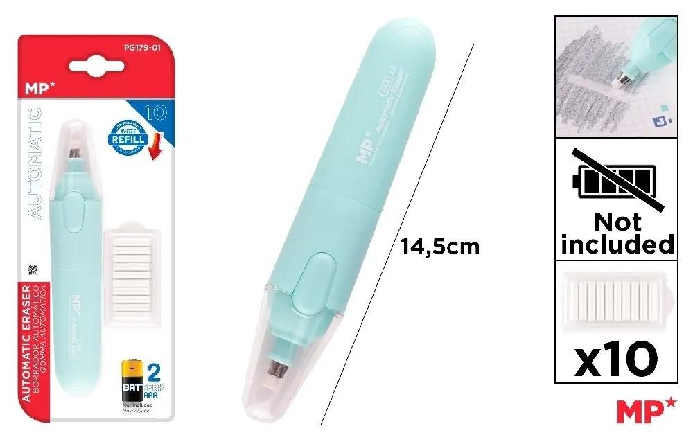 Plastikowy, gumowy uchwyt z przyciskiem do stopniowego wysuwania gumki. Zawiera 12 białych patyczków gumki. Guma nietoksyczna. Działa na 2 baterie AAA (brak w zestawie). Blister 1 niebieskiej sztuki.
