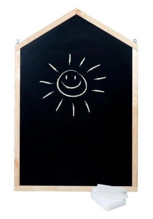 Tablica Domek 1 - wisząca drewniana naturalna magnetyczno-kredowa jednostronna tablica, kolor powierzchni magnetyczne czarny. Zestaw zawiera kredę i gąbkę oraz zawieszki.
