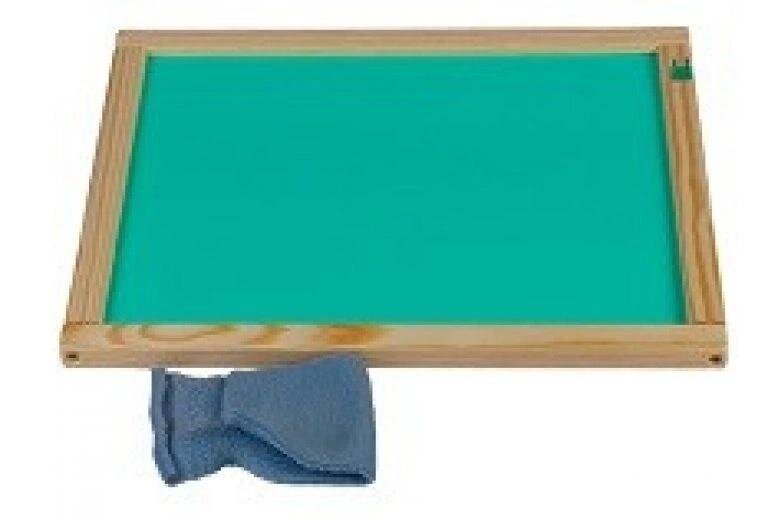 Drewniany dwustronny notatnik suchościeralny, jedna strona żółta, druga strona miętowa. W zestawie marker.