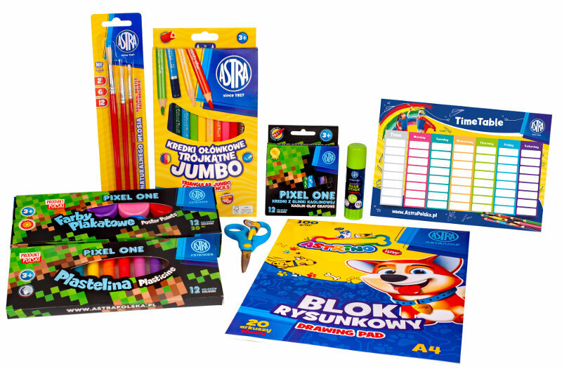 Wyprawka szkolna Astra Pixel One S (12 elementów).Wyprawka szkolna Astra to zbiór wszystkich niezbędnych artykułów szkolnych, specjalnie przygotowanych w celu ułatwienia dzieciom nauki i organizacji w szkole.Zapewnia uczniom wygodę i porządek poprzez przechowywanie wszystkich najważniejszych przyborów szkolnych w jednym miejscu.Wszystkie elementy zestawu zostały umieszczone w wygodnym opakowaniu z rączką.Zawartość zestawu:- blok rysunkowy ASTRAPAP A4 100g 20 ark Pixel,- farby plakatowe AS 12 kol. 20 ml,- plastelina Pixel One 12 kolorów,- kredki ołówkowe jumbo okrągłe Pixel One 12 kolorów + temperówka,- pędzel szkolny okrągły nr 1,- kredki grafionowe Pixel One 12 kolorów,- klej w sztyfcie Astra 8g,- klej biały zapachowy 45 ml,- nożyczki easy open - blister,- pędzel szkolny okrągły nr 4,- pędzel szkolny okrągły nr 12,- plan lekcji.Wymiary opakowania: 34x23,5x9,5cmWiek: 3+