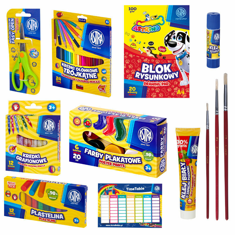 Cechy produktu: - zestaw plastyczny wyprawka szkolna powstał z myślą o uczniach stawiających pierwsze kroki w szkole, - dzięki wyborowi niezbędnych artykułów plastycznych i piśmienniczych sprawdzi się doskonale również w przedszkolu, - wszystkie elementy zestawu zostały umieszczone w wygodnym, przenośnym opakowaniu z rączką. Zawartość opakowania: - blok rysunkowy ASTRAPAP A4 100g 20 ark Astrino, - farby plakatowe 6 kolorów - 20 ml, - kredki ołówkowe trójkątne Astra 24 kolory, - pędzel szkolny okrągły nr 1, - kredki grafionowe Astra 12 kolorów, - klej w sztyfcie Astra 8g PVP, - klej biały zapachowy ASTRA 45 ml, - nożyczki easy open - blister, - pędzel szkolny okrągły nr 4, - pędzel szkolny okrągły nr 12, - plastelina 12 kolorów, - plan lekcji ASTRA. Wymiary opakowania: 34x23,5x9,5cm