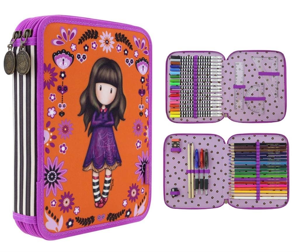 Podwójny Piórnik z Wyposażeniem - Gorjuss - Cobwebs. Podwójny piórnik z wizerunkiem dziewczynek Gorjuss w odcieniach królewskiej purpury i nasyconego pomarańczu. Pierwsza komora zawiera 2 ołówki, komplet 3 długopisów i 18 kredek, gumkę, oraz temperówkę. Druga komora wyposażona została w komplet 18 flamastrów, linijkę, ekierkę i kątomierz. Ozdobiony medalionami w stylu antycznego mosiądzu. Każdy element wyposażenia posiada logo Santoro. Zawiera wszystko to, co potrzebne do szkoły. Wykonany ze szczególną dbałością. Wewnątrz posiada ciekawy wzór. Wspaniały na prezent.