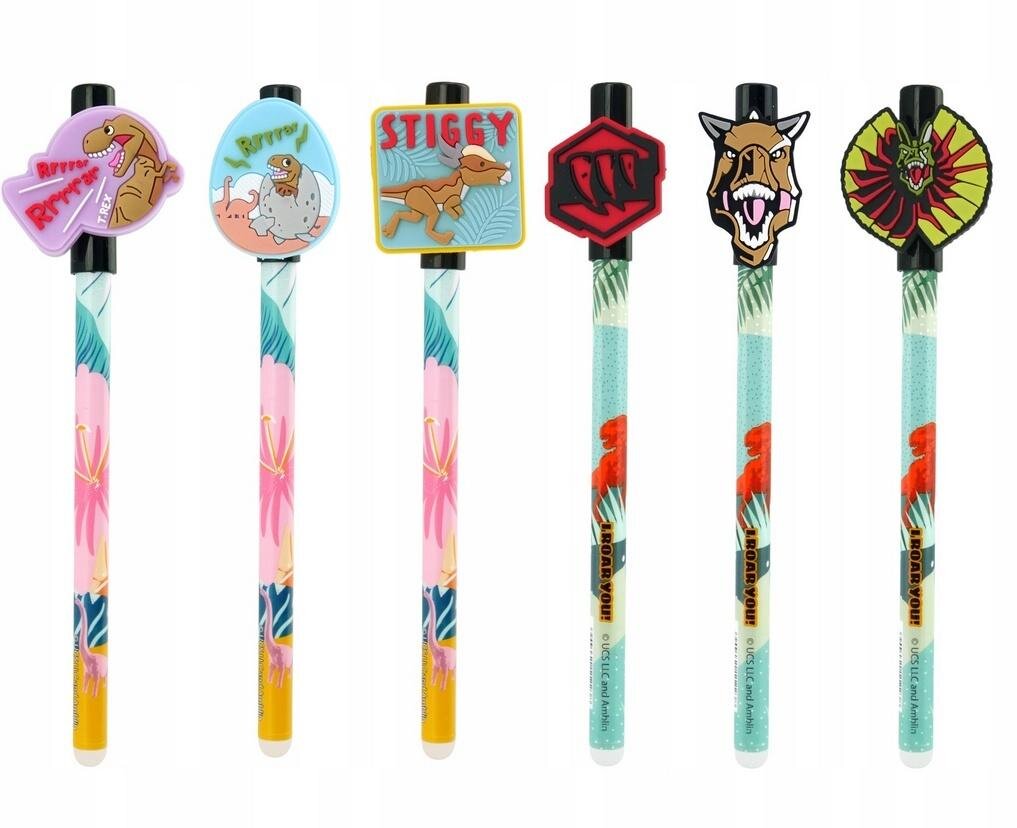 Długopis z licencyjnym motywem graficznym, posiada niebieski wymazywalny wkład. Końcówka długopisu pozwala zmazać napisany tekst. Dostępny w 6 motywach Jurassic Park.