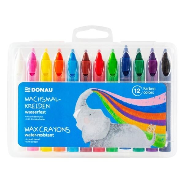 Barevné voskové pastelky 12 ks;Voděodolné;Dodáváno včetně křídové škrabky ;V průhledném pouzdře z PP s eurozávěsem číst celé