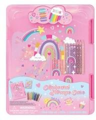 Plastikowa sztywna teczka zamykana na zatrzaski do schowania kartek, rysunków, drobiazgów czy akcesoriów do malowania. Zmieści rozmiar A4. Teczka na przodzie ma ozdobny klips, dzięki któremu można użyć jej również jako podkładki do pisania lub malowania. W zestawie 12 kolorów kredek ołówkowych oraz mini-notes z czystymi kartkami. Idealny zestaw do rozpoczęcia przygody z malowaniem dla małego artysty! Wiek: 5+