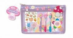 Zestaw zawiera: - kołozeszyt sketchbook - 3 długopisy żelowe z ozdobnymi nakładkami - arkusz naklejek - 2 klamerki z ozdobnymi nakładkami - pieczątki w rollerze w 5 kolorach i wzorach Zestaw zapakowany w ozdobną saszetkę zamykaną na zamek z uchwytem do wygodnego przenoszenia. Wiek: 5+