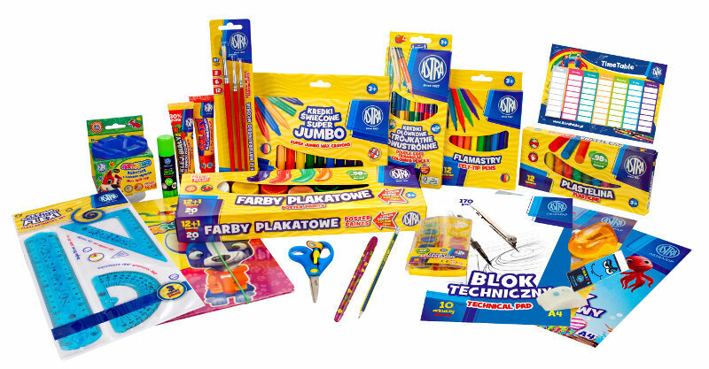 Wyprawka szkolna Astra XL (27 elementów).Wyprawka szkolna Astra to zbiór wszystkich niezbędnych artykułów szkolnych, specjalnie przygotowanych w celu ułatwienia dzieciom nauki i organizacji w szkole.Zapewnia uczniom wygodę i porządek poprzez przechowywanie wszystkich najważniejszych przyborów szkolnych w jednym miejscu.Wszystkie elementy zestawu zostały umieszczone w wygodnym opakowaniu z rączką.Zawartość zestawu:- blok kolorowy barwiony w masie ASTRAPAP A4 80g 15 ark,- blok rysunkowy ASTRAPAP A4 100g 20 ark,- blok techniczny Astra A4 240g,- długopis automatyczny Quick 0.7 mm Astra Pen,- pióro młodzieżowe Fresh,- ołówki grafitowe Astra z czarnego drewna z gumką HB,- ołówek z tabliczką mnożenia Astra,- farby plakatowe 12 kolorów 20ml NOWE,- kredki oł. trójk. dwustronne ASTRA 12=24K,- kredka Jumbo ołówkowa trójkątna Astra - Tęczowa,- flamastry CX - 10 kolorów,- pędzel szkolny okrągły nr 1,- kredki grafionowe Astra 12 kolorów,- kubeczek z blokadą wylania,- klej GALAXY Tuba 40 ml,- klej biały zapachowy 45 ml,- klej w sztyfcie Astra Pen transparent 15g,- gumka myszka Astra,- gumka do ścierania Astra Pen SMART S,- temperówka z dwoma otworami Astra DUO,- nożyczki easy open - blister,- linijka Flexi 20 cm,- pędzel szkolny okrągły nr 4,- pędzel szkolny okrągły nr 12,- farby akwarele 12 kol. FI 23.5,- plastelina 12 kolorów.Wymiary opakowania: 42,5x23,5x11cmWiek: 3+