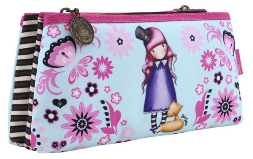 Podwójny Piórnik - Gorjuss - The Dreamer. Podwójny piórnik ozdobiony grafiką egzotycznych kwiatów w delikatnych odcieniach błękitu i pudrowego różu. Zawiera dwie zapinane na suwak kieszenie. Suwak ozdobiony medalionem w stylu antycznego mosiądzu z główką dziewczynki Gorjuss. Zmieszczą się w nim zarówno ołówki i długopisy, a także przybory do szycia czy inne drobiazgi. Wykonany ze szczególną dbałością. Wewnątrz posiada ciekawy wzór w stylowe paski. Wspaniały prezent do szkoły lub pracy.