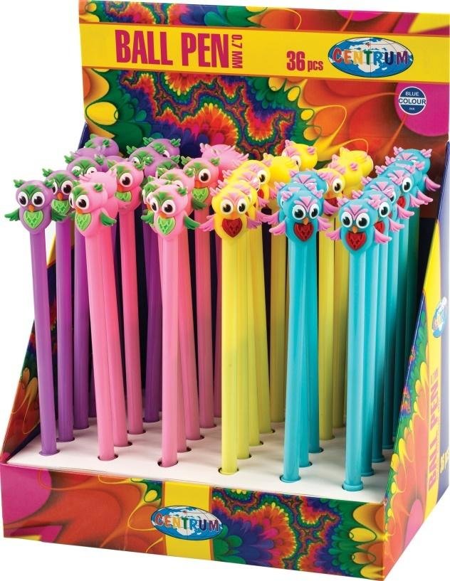Długopis kulkowy z gumową nakładką w kształcie sowy. Kolor wkładu:niebieski Grubość linii pisania: 0,7 mm.Opakowanie zbiorcze: 36 szt.