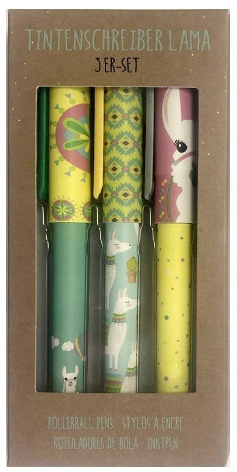 Zestaw 3 Długopisów - Lama. Zestaw trzech długopisów kulkowych ze skuwką. Dwa długopisy z niebieskim wkładem, a jeden z wkładem czarnym. Zestaw zapakowany w ozdobne, kartonowe pudełko z okienkiem.
