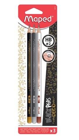 Olówki Black\'Peps DECO. Twardosc HB. Wykonane z drewna lipowego. Trójkatny przekrój. Grafit odporny na zlamania. Dostepne w 3 wersjach kolorystycznych: czarny, bialy i szary z wzorami w metalicznych kolorach. Na blistrze miks 3 wzorów.