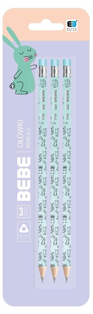 3 ołówki z gumką w pastelowym niebieskim kolorze na blistrze. Na ołówku zadruk z wizerunkami zwierzaków B&B z magicznego lasu. Trójkątny profil ołówka poprawia komfort jego użytkowania.