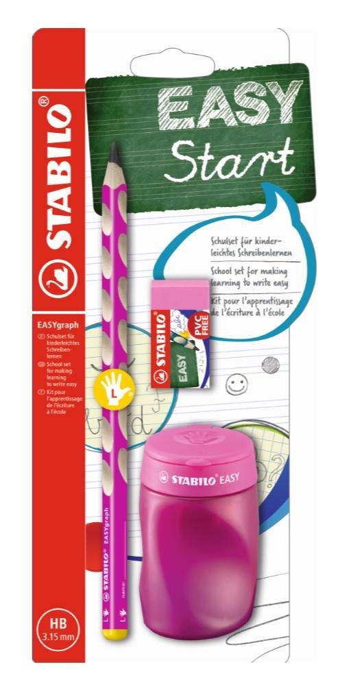 STABILO EASYgraph to przeznaczone dla dzieci w wieku przedszkolnym i szkolnym ergonomiczne ołówki o twardości HB, trójkątnym przekroju, średnicy grafitu 3,25 mm, dostępne w kolorze różowym lub niebieskim. Zaprojektowane z myślą o dzieciach praworęcznych (czerwona końcówka) i leworęcznych (żółta końcówka). Posiadają miejsce na wpisanie imienia, zapewniają wygodny chwyt podczas trzymania, a specjalny lakier zabezpiecza strefę uchwytu przed brudzeniem. W zestawie znajdują się: jeden ołówek jumbo, wyprofilowana pod dłoń temperówka oraz gumka.