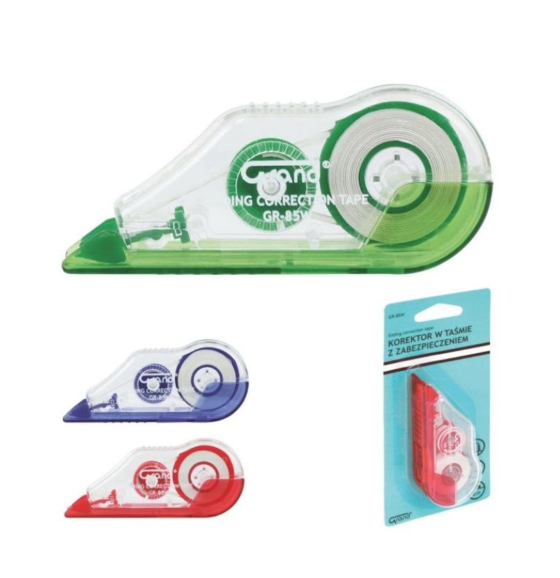Niewidoczny na fotokopiach, dobrze pokrywa korygowaną powierzchnię, transparentna obudowa pozwala na kontrolę stopnia zużycia taśmy, kolorowe zasuwane zamknięcie zabezpiecza taśmę