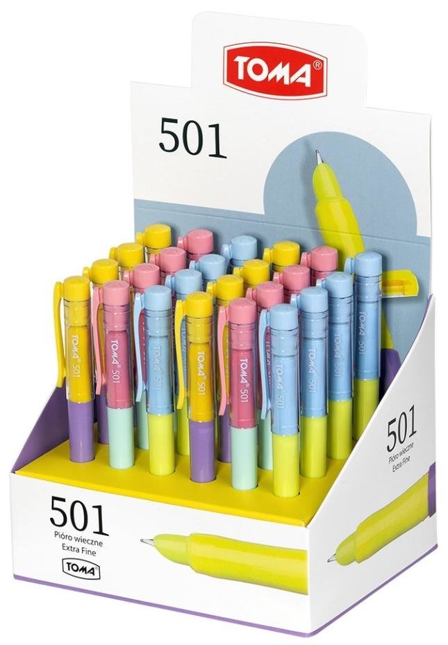 Pióra wieczne ze stalówką ze stali szlachetnej, idealną dla uczniów kształtujących własny charakter pisma, stalówka pozwala na pisanie linią 0,3-0,4 mm. Pióra przeznaczone są do użytku szkolnego, zasilane standardowymi nabojami atramentowymi (nabój w komplecie), są dostępne w 3 wersjach kolorystycznych, pakowane w display\'u po 24 sztuki.