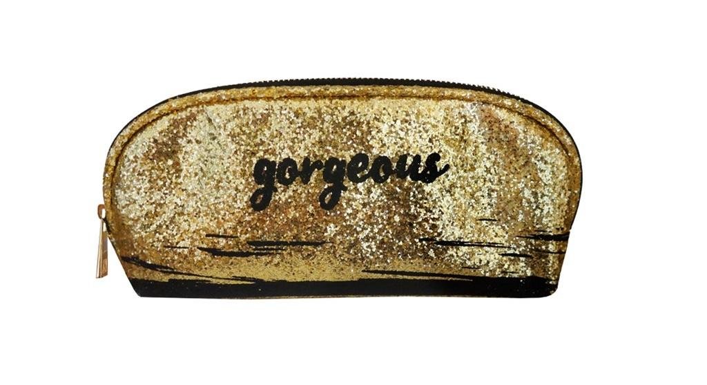 Piórnik saszetka.Zapinany na zamek.Kolor złoty.Brokatowy.Ozdobiony czrnym napisem "gorgeous". číst celé