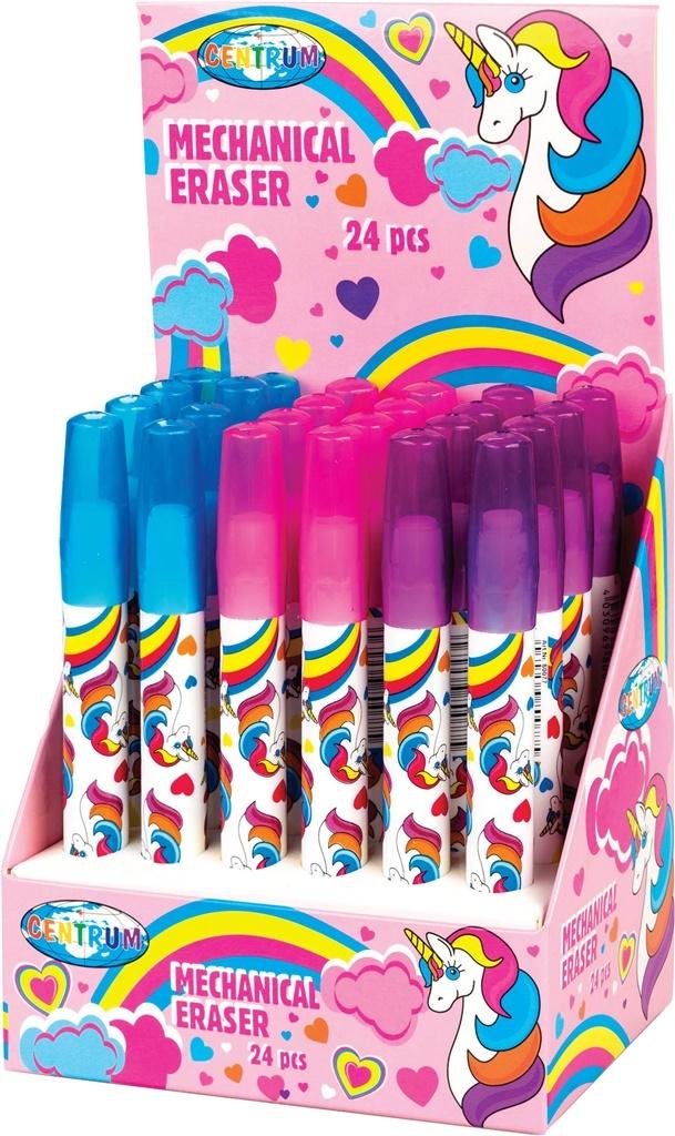 Opakowanie zbiorcze 24 sztuki.Wysuwana gumka do ścierania z nadrukiem jednorożca. Obudowy w miksie kolorystycznym.