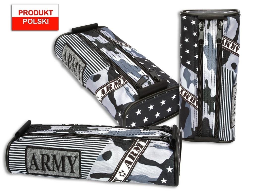 Piórnik owal wykonany z kodury, ozdobionej nadrukiem. Aplikacja haft komputerowy, naszywki army. Posiada 2 zamki błyskawiczne, a co za tym idzie 2 komory. Piórnik o wymiarach 21x4,5x9,5[cm]. Piórnik bez wyposażenia.