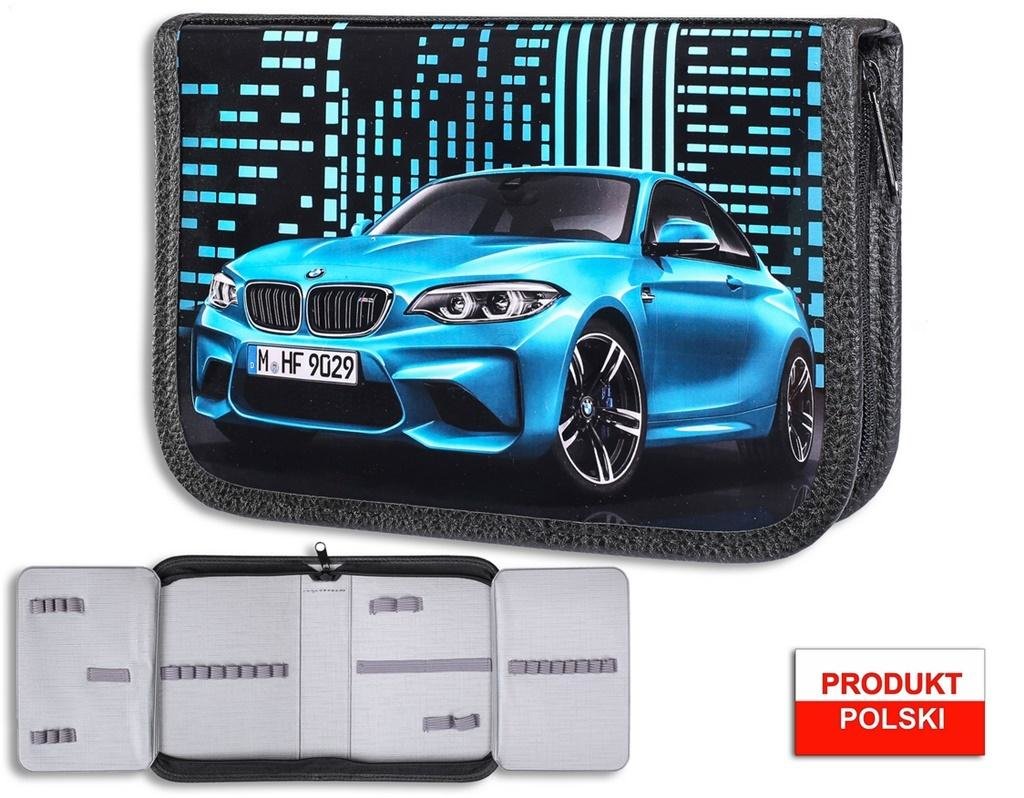 Piórnik twardy z 2 klapkami w środku, wykonany z kodury, ozdobiony obrazkiem przedstawiającym samochód. W środku piórnika znajdują się gumki umożliwiające trzymanie długopisów. Piórnik o wymiarach 20x14x5[cm]. Piórnik bez wyposażenia.