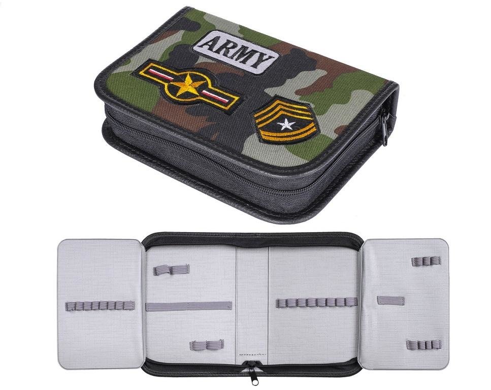 Piórnik twardy wykonany z codury moro, ozdobiony aplikacjami wojskowymi. W środku znajdują się 2 rozkładane klapki z gumkami na długopisy. číst celé