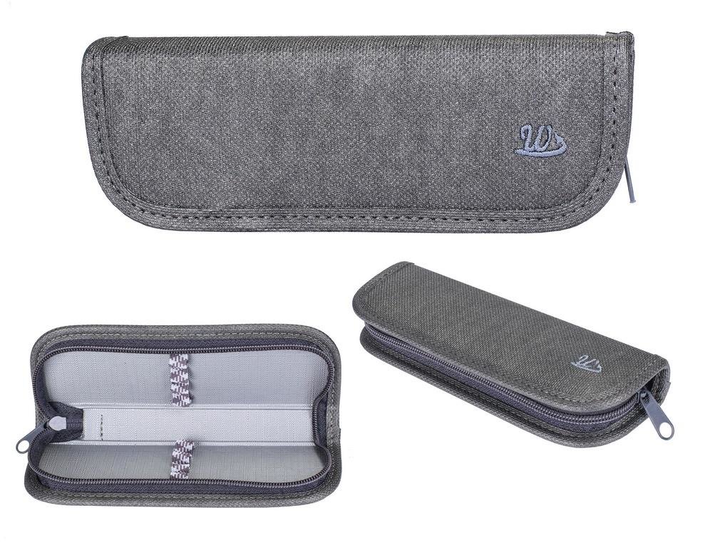 Piórnik na długopisy zamykany zamkiem błyskawicznym. W środku znajdują się gumki do zamocowania długopisów. Ozdobiony haftem przedstawiającym logo W.