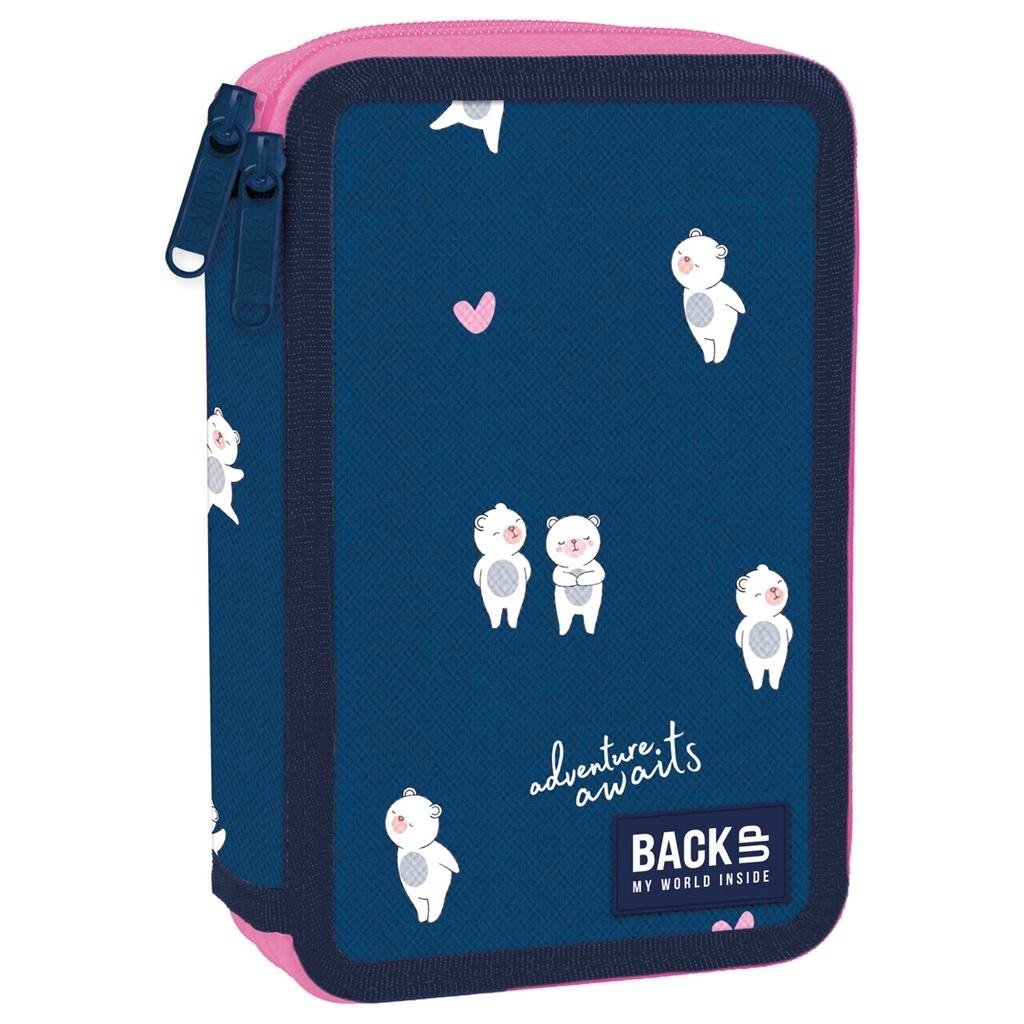 Pełen miłości wzór, gdzie pluszowe niedźwiadki, przeplatane serduszkami tulą się do siebie. Dwukomorowy piórnik z wyposażeniem w granatowym kolorze, ozdobiony uroczymi, zakochanymi misiami w zabawnych pozach. Głęboki granat idealnie współgra z białym i różowym kolorem. Pozytywny, słodki motyw wprowadzi Cię w doskonały nastrój każdego dnia. Białe niedźwiadki zapraszają byś wyruszył z nimi w poszukiwaniu przygód. Adventure awaits!