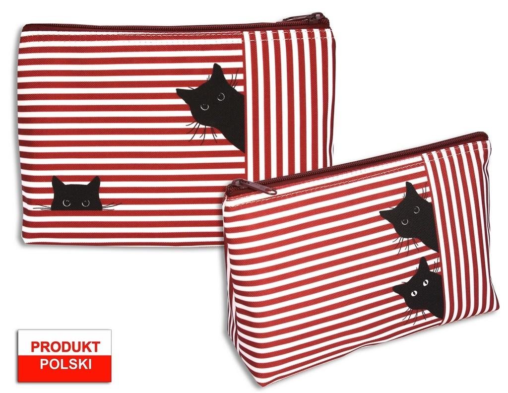 Kosmetyczka wykonana z kodury, ozdobionej nadrukiem przedstawiającym koty. Kosmetyczka o wymiarach 21,5x8[cm]. Piórnik bez wyposażenia.