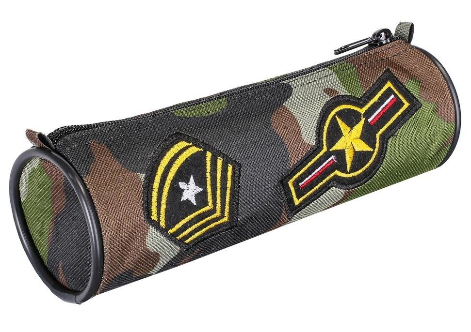 Piórnik tuba wykonany z codury moro, ozdobiony aplikacjami wojskowymi. číst celé