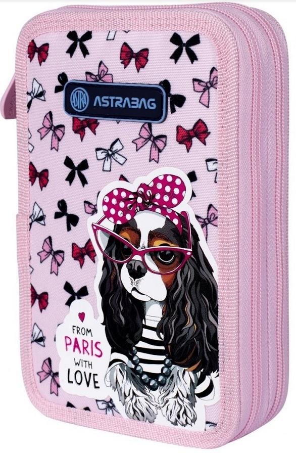 Określenie francuski piesek nabrało właśnie nowego znaczenia. Podwójny piórnik Astrabag z uroczym motywem graficznym przedstawiającym modną paryską spanielkę skradnie serce każdej dziewczynki kochającej pieski i róż. Piórnik Astrabag nie posiada wyposażenia. Jednak dzięki dwóm pojemnym komorom pomieści niezbędne przybory, w tym kredki, flamastry, ołówki, długopisy i linijki.