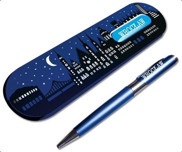 Pamiątkowy długopis z etui ozdobiony motywami związanymi z polskimi miastami. číst celé