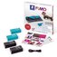 FIMO LEATHER efekt je inovativní a flexibilní možnost jak využívat skvělých vlastností FIMO hmoty. Můžete šít, stříhat a tvarovat jako běžnou kůži. FIMO leather sada v novém svěžím designu, skvělý dárek jak pro začínající uživatele tak i pro ty zkušenější. Značka DIY (Do it yourself) - znamená ,,vyrob si to sám". Díky této sadě zvládnete vyrobit šperky, které vám bude každý závidět. Sada obsahuje 4 půlbloky FIMO Leather 25 g - 2 x FIMO Leather černá, 2 x FIMO Leather laguna elastická stuha 70 cm tutoriál krok za krokem Fimo hmota je polymerová hmota která je vyrobená z umělých modelovacích materiálů, složených z polyvinylchloridu, gelů, pryskyřic, barviv a změkčovadel. Díky své tvárnosti můžeme polymerovou hmotu tvarovat do nejrůznějších tvarů, ze kterých se dají vyrábět šperky či dekorativní nebo bytové doplňky. Vypaluje se v troubě po dobu 30 minut na 130 °C.