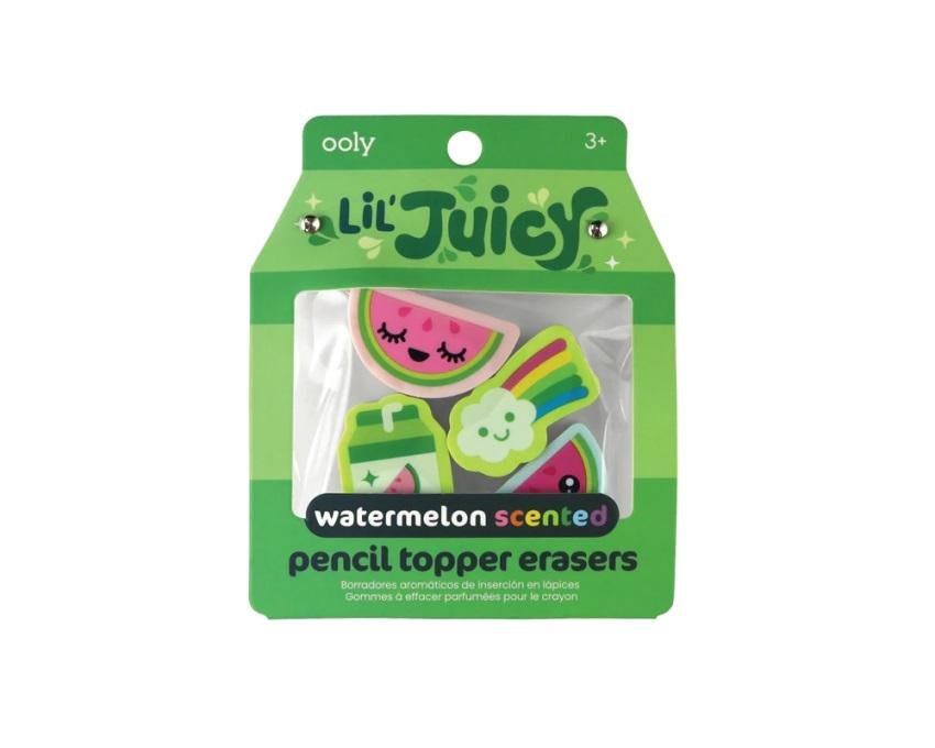 Zestaw pachnących, nakładanych na ołówek gumeczek do ścierania zapakowany jest w słodkie pudełeczko przypominające owocowy soczek. W środku znajdują się trzy gumeczki inspirowane owocami i jedna wesoła gumka w kształcie chmurki i tęczy. Każda z nich pachnie soczystym arbuzem. Gumki mogą być nakładane na ołówki dzięki czemu zawsze są gotowe do poprawiania błędów.