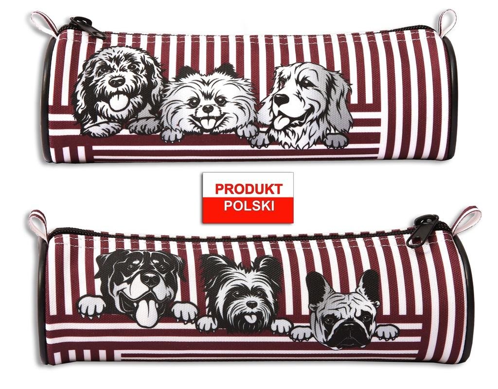 Piórnik tuba wykonany z kodury, ozdobionej nadrukiem przedstawiającym psy wykonanym w technologii sublimacji. Piórnik o wymiarach 21x7[cm].