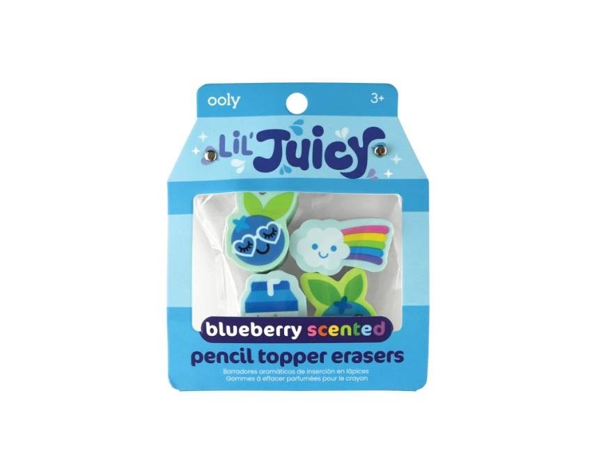 Zestaw pachnących, nakładanych na ołówek gumeczek do ścierania zapakowany jest w słodkie pudełeczko przypominające owocowy soczek. W środku znajdują się trzy gumeczki inspirowane owocami i jedna wesoła gumka w kształcie chmurki i tęczy. Każda z nich pachnie soczystymi jagódkami. Gumki mogą być nakładane na ołówki dzięki czemu zawsze są gotowe do poprawiania błędów.