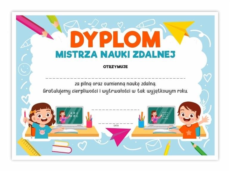 Dyplom mistrza nauki zdalnej idealnie sprawdzi się jako pamiątka oraz nagroda za ten wyjątkowy rok szkolny odbyty online!