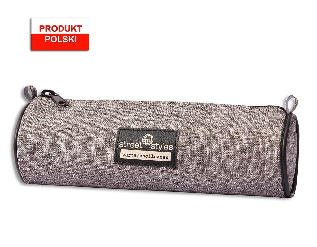 Piórnik tuba wykonany z szarej kodury, ozdobiony naszywką street style. Piórnik o wymiarach 21x7[cm].