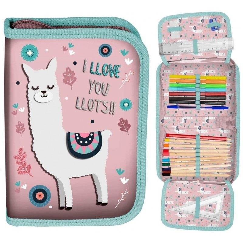 Piórnik jednokomorowy z dwoma klapkami z wyposażeniem (długopis, ołówek, 7 pisaków, 9 kredek, gumka, linijka, temperówka, ekierka). Zadrukowane kolorowe wnętrze. číst celé