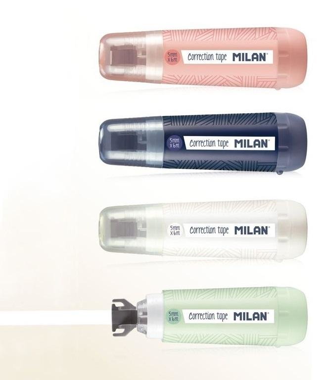 "Korektory mini w taśmie nawiązujące kolorystyką do Serii 1918. Cylindryczne,posiadają skuwkę zabezpieczającą. Odpowiednie dla osób leworęcznych dzięki obrotowej końcówce. Rozmiar taśmy: szerokość 5 mm x długość 6 m. Szybki, czysty i dokładny. Korekty na wszystkich rodzajach papieru. Nie pozostawia śladów na kserokopiach. Seria 1918 jest inspirowana oryginalnymi kolorami i wzornictwem gumek MILAN. Rozmiar korektora: 7,7 x ? 2,2 cm.