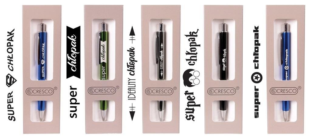 Metalowy, automatyczny długopis CARLOS z nadrukiem jako prezent na różne okazje dla chłopaka. Zapakowany w prezentowe etui. Wkład niebieski wymienny.