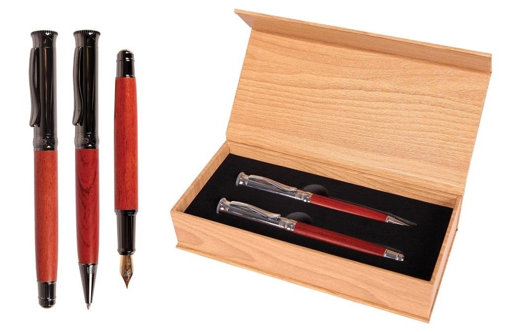 Korpusy wykonane z drewna w czerwonobrązowym kolorze. Pozostałe elementy wykonane z metalu, który został pokryty powłoką o tytanowo-antracytowym połysku. Materiał - metal (stal) i drewno. Pióro: stalówka (M) dwukolorowa z irydowa końcówką. Długopis: metalowy wkład (1 mm), wielkopojemny typu Parker, kolor niebieski, mechanizm włączania obrotowy. Opakowanie - eleganckie pudełko w kolorze jasnego drewna, czarna wkładka i czarna wsuwka ochronna.