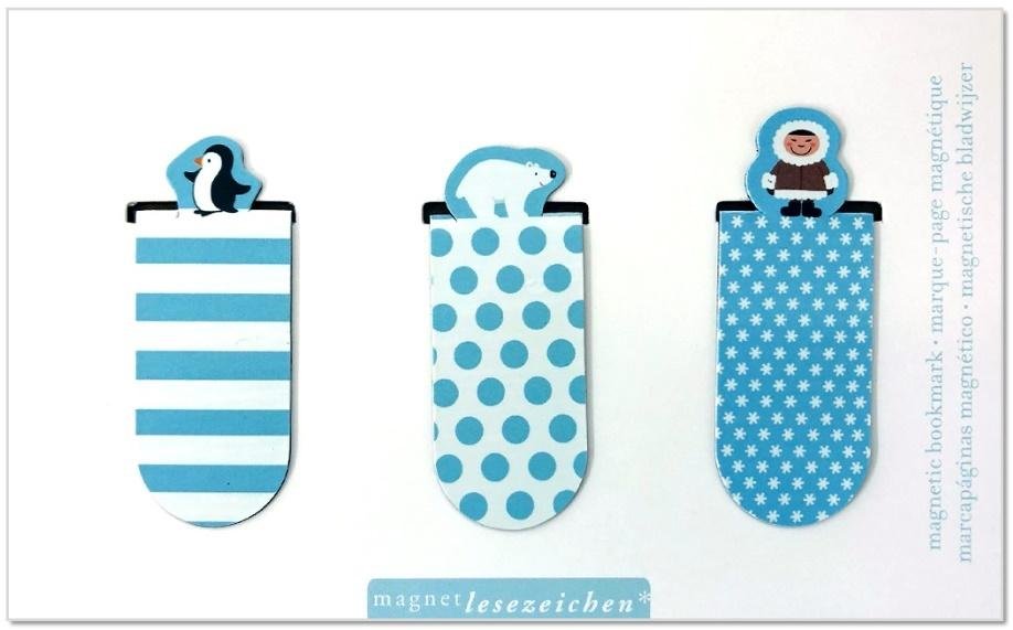 Zakładki magnetyczne - Biegun Polarny. Pięknie ilustrowane zakładki z wystającymi, ozdobnymi elementami. Idealne do zaznaczania ostatnio czytanych lub ulubionych fragmentów książek. Doskonale sprawdzają się w indeksowaniu notatek, dokumentów w biurze, w szkole i w domu. Każdy zestaw zawiera 3 zakładki o różnych wzorach. Trzy zakładki magnetyczne w zestawie są tematycznie skoordynowane. Skomponuj własną kolekcję z zakładkami: Safari, Plaża.