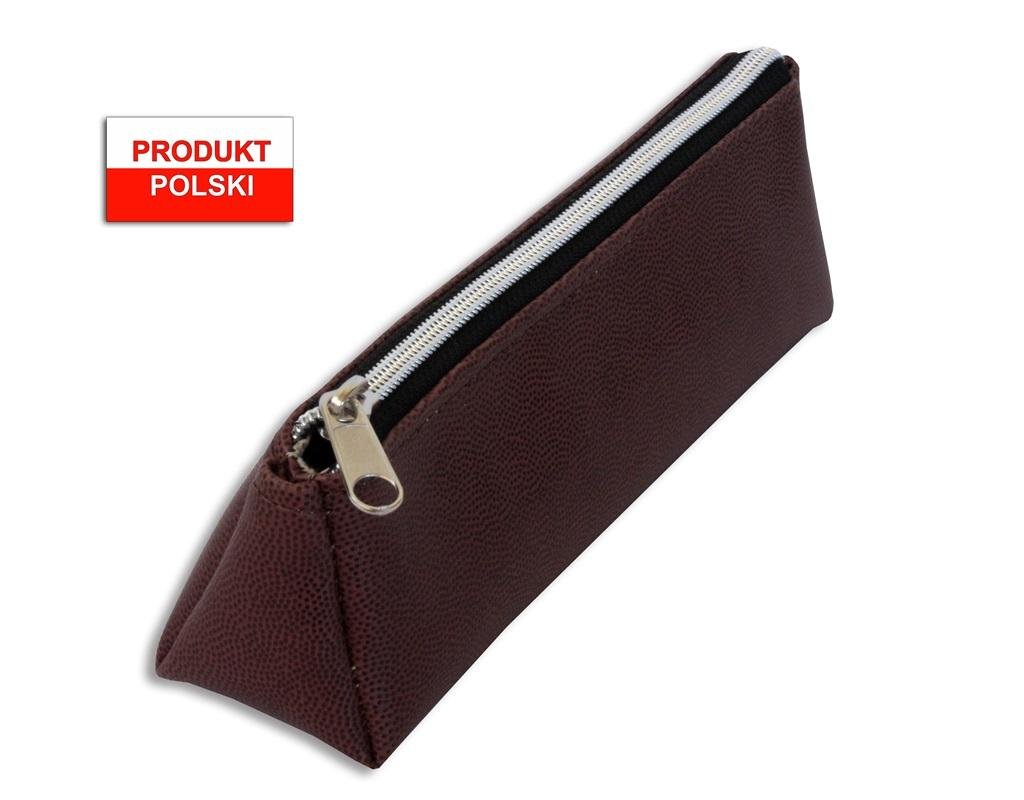 Piórnik kosmetyczka na długopisy zamykany zamkiem błyskawicznym. Wykonany z tkaniny skóropodobnej w kolorze brązowym. Wymiary 21 x 6,5 x 4,5 cm. Piórnik bez wyposażenia.