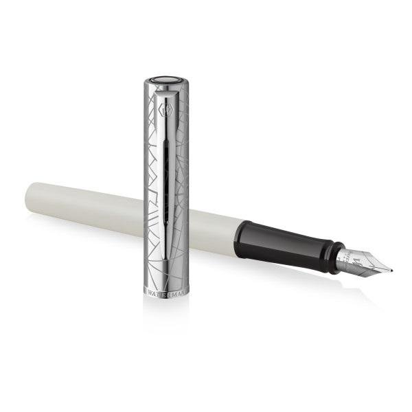 Pióro wieczne Waterman Allure Deluxe Metal & White Lacquer z grawerowaną nasadką oraz stalówką fine ze stali szlachetnej.