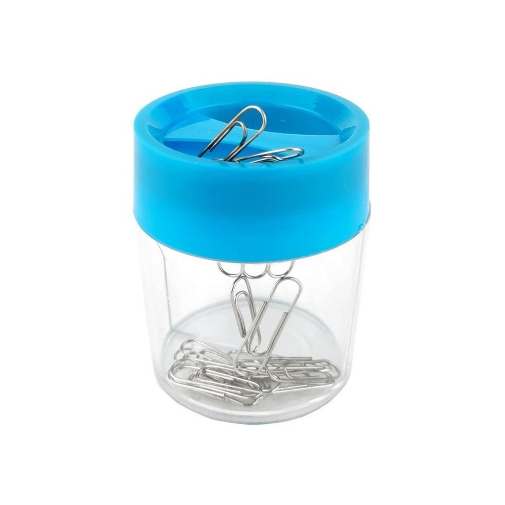 Pojemnik na spinacze okrągły. Wyposażony w magnetyczną pokrywką ułatwiającą wyjmowanie spinaczy. Poręczny i wygodny w użyciu, niezbędny w każdej pracy biurowej.
