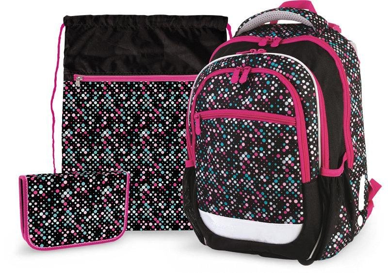 Školní set obsahuje: 1. Školní aktovka - kvalitní, ergonomicky tvarovaná odlehčená školní aktovka je vybavena reflexními prvky a anatomicky tvarovanými zády s pevnou konstrukcí. 2. Školní penál jednopatrový, prázdný s dvěma chlopněmi, o rozměru š.195 x v.35 x h.130 mm 3. Školní sáček na cvičky vhodný pro žáky 1. stupně ZŠ vyroben z pevného, kvalitního materiálu. Rozměr sáčku na přezůvky 440 x 320 mm. Školní aktovka pro prvňáčka (VHODNÁ PRO 1. - 3. TŘÍDU) Kvalitní, ergonomicky tvarovaná odlehčená školní aktovka je vybavena reflexními prvky a anatomicky tvarovanými zády s pevnou konstrukcí. Školní aktovky Stil jsou ověřeny odborníky. PARAMETRY školní aktovky Rozměr: výška 380 mm, šířka 320 mm, hloubka 220 mm Hmotnost: 1 kg Nosnost: 7 kg Objem: 17 l