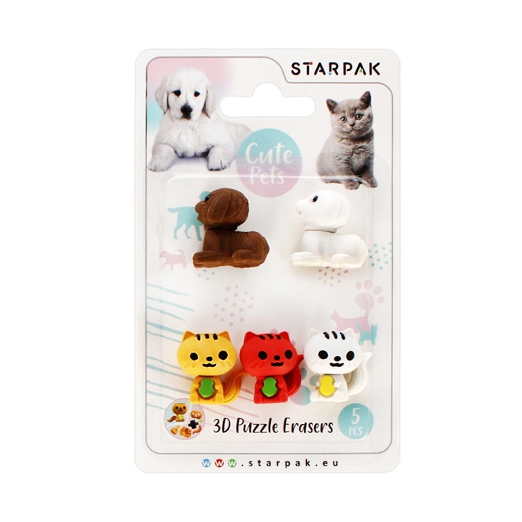 Malé pryže pejsci a kočičky. Lze je použít také jako 3D puzzle, jednotlivé prvky se od sebe odlepují a dají se libovolně kombinovat. Obsah balení je 5 gum. Rozměry balení jsou 10x15x3cm. Určeno pro děti ve věku: 3+. číst celé