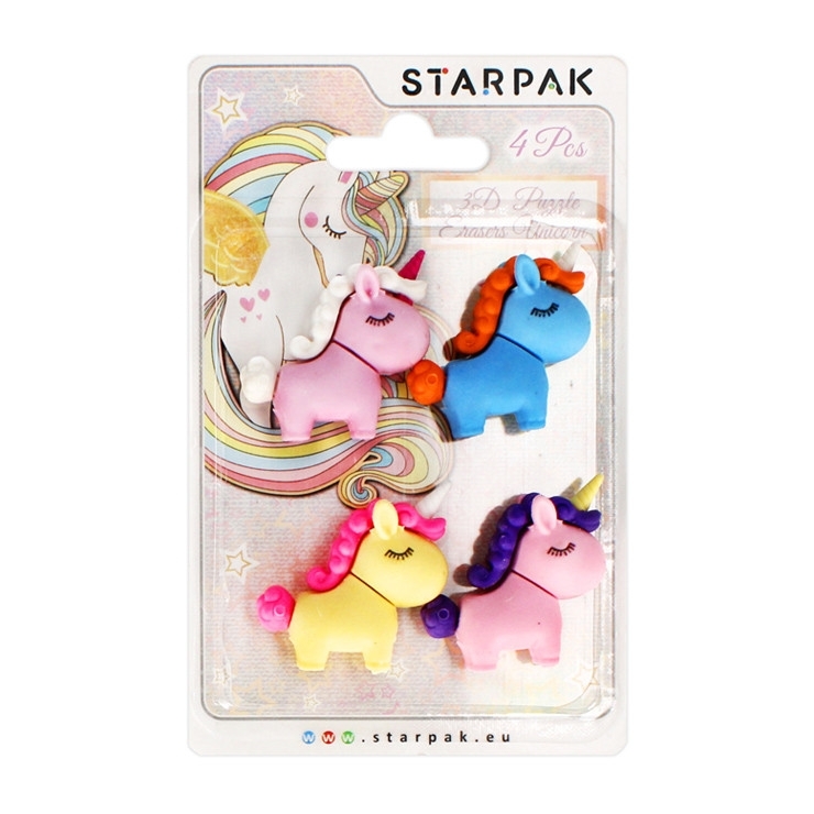 Guma jednorožec. Obsah setu je 4 gumy. Rozměry balení jsou 10x15x3cm. Určeno pro děti ve věku: 3+. číst celé